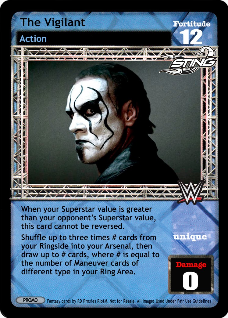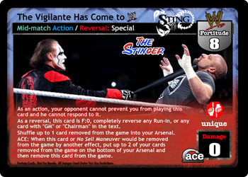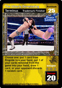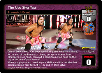 Cannot be blanked. Can be played during any Pre-match phase. At the end of the Pre-match phase, put up to 3 cards from Ringside in your hand, then put 2 cards from your hand on the top or bottom of your Arsenal. When you play a card listed in your Ability and it is not the first card played on your turn, it is +3D and +1 Stun Value.