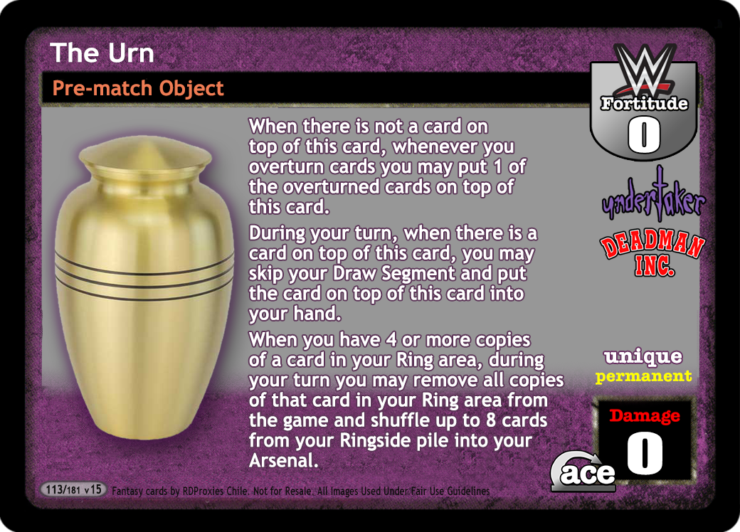 When there is no card on top of this card, whenever you overturn cards you may put 1 of the overturned cards on top of this card instead of your Ringside pile. During your turn, when there is a card on top of this card, you may skip your Draw Segment and put the card on top of this card into your hand. When you have 4 or more copies of a card in your Ring area, during your turn you may remove all copies of that card in your Ring area from the game and shuffle up to 8 cards from your Ringside pile into your Arsenal.