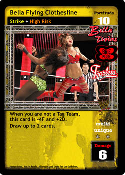 Can only be played by Brie Bella. When you are a Throwback Superstar, this card is Multi when played after a card with 'diva' in the title or text. As a reversal, reverse any High Risk or any maneuver with 'can only be reversed' in the text. Draw up to 2 cards, and your opponent puts 2 random cards from his hand on the bottom of his Arsenal.