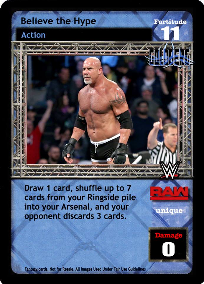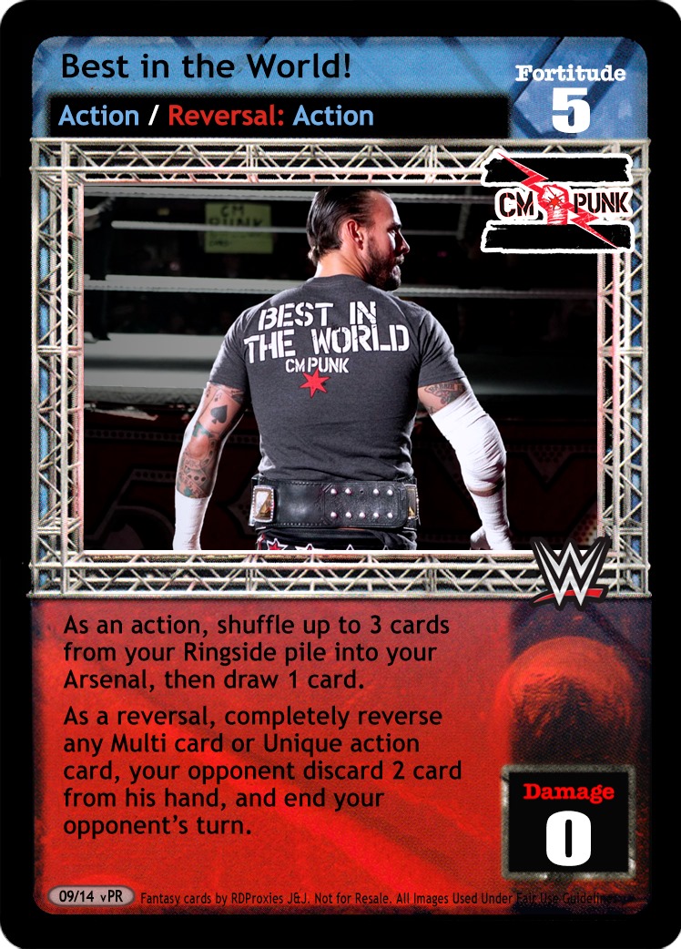 As an action, shuffle up to 3 cards from your ringside pile into your arsenal, then draw 1 card. As a reversal, completely reverse any multi or unique action card, your opponent discard 2 cards from his hand, and end your opponent`s turn.