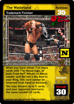 When you have either 7 or more cards with The Nexus logo, or both the cards titled From NXT Winner to Nexus Leader and Barrett's Big Boot in your Ring, this card cannot be reversed from hand or Backlash. You may discard up to 5 cards, and your opponent overturns the same number of cards.