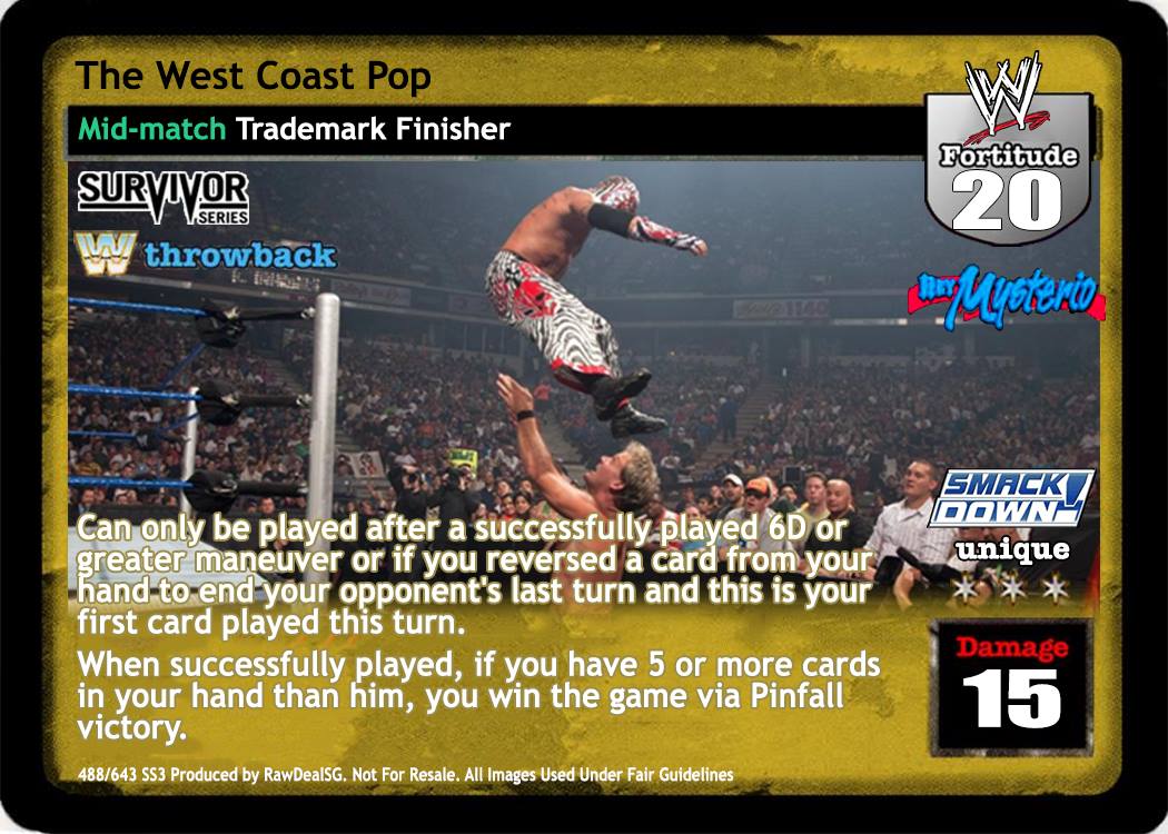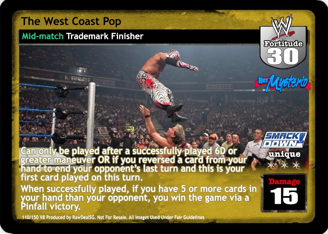 Can only be played after a successfully played 6D or greater maneuver or if you reversed a card from your hand to end your opponent's last turn and this is your first card played this turn. When successfully played, if you have 5 or more cards in your hand than him, you win the game via Pinfall victory.