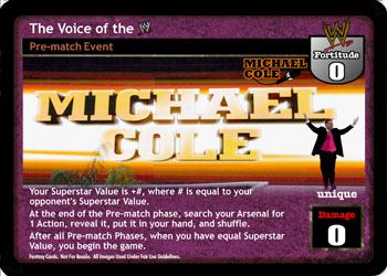 This card and Managed by Stevie Richards do not take up a Pre-match slot in your Ring. Your Battling the Voices are Multi, and during your turn, ACE: you may remove one of those cards in your Ring from the game to put a Victoria-specific action from your Ringside into your hand. If that card is Backed by Torrie and Candice, you may put that card into your Ring instead.