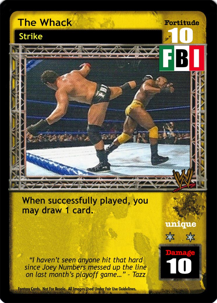 Can only be played after a successfully played 6D or greater maneuver OR if you reversed a card from your hand to end your opponent's last turn and this is your first card played on this turn. When successfully played, if you have 5 or more cards in your hand than your opponent, you win the game via a Pinfall victory.