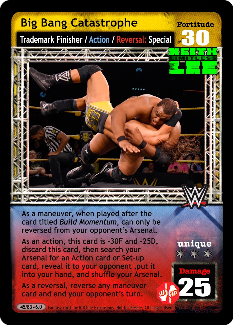 As a maneuver, when played after the card title “Build Momentum”, can only be reversed from your opponent`s arsenal. As an action, this card is -30F and -25D, discard this card, then search your arsenal for an action card or Set-up card, reveal it to your opponent, put it into your hand and shuffle your arsenal. As a reversal, reverse any maneuver card and end your opponent`s turn.