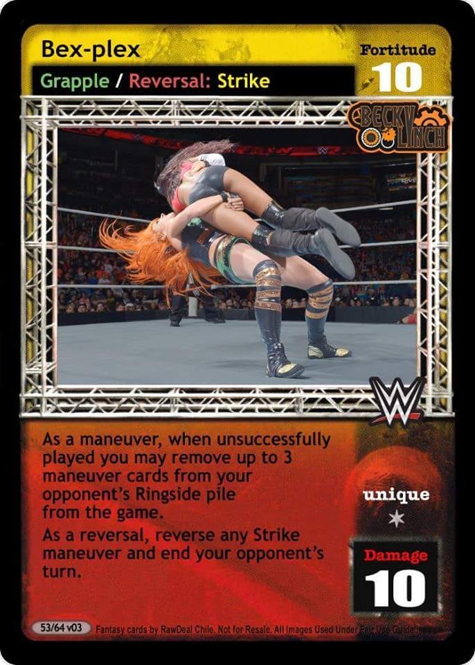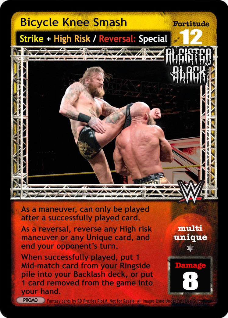 as a maneuver, can only be played after a successfully played card as a reversal, reverse any high risk maneuver or any unique card, and end your opponent's turn when successfully played, put 1 mid-match card from your ringside pile into your backlash deck, or put 1 card removed from the game into your hand