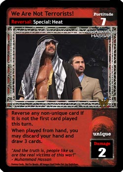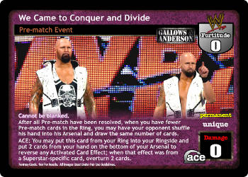Cannot be blanked. After all Pre-match have been resolved, when you have fewer Pre-match cards in the Ring, you may have your opponent shuffle his hand into his Arsenal and draw the same number of cards. ACE: You may put this card from your Ring into your Ringside and put 2 cards from your hand on the bottom of your Arsenal to reverse any Activated Card Effect; when that effect was from a Superstar-specific card, overturn 2 cards.
