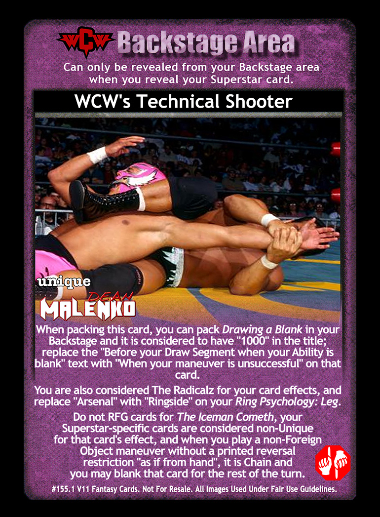 When packing this card, you can pack Drawing a Blank in your Backstage and it is considered to have '1000' in the title; replace the 'Before your Draw Segment when your Ability is blank' text with 'When your maneuver is unsuccessful' on that card. You are also considered The Radicalz for your card effects, and replace 'Arsenal' with 'Ringside' on your Ring Psychology: Leg. Do not RFG cards for The Iceman Cometh, your Superstar-specific cards are considered non-Unique for that card's effect, and when you play a maneuver without a printed reversal restriction 'as if from hand', it is Chain and you may blank that card for the rest of the turn.
