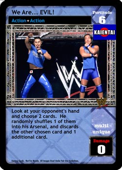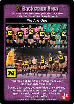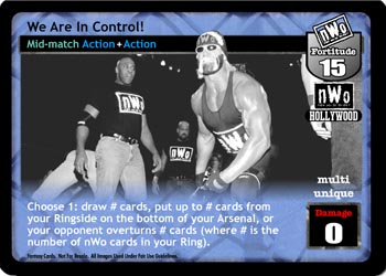 Choose 1: draw # cards, put up to # cards from your Ringside on the bottom of your Arsenal, or your opponent overturns # cards (where # is the number of nWo cards in your Ring).