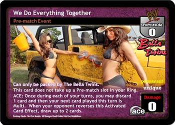 Can only be packed by The Bella Twins. This card does not take up a Pre-match slot in your Ring. ACE: Once during each of your turns, you may discard 1 card and then your next card played this turn is Multi. When your opponent reverses this Activated Card Effect, draw up to 2 cards.