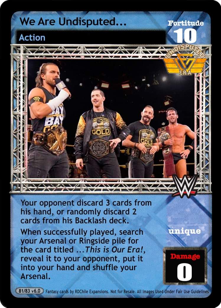 Your opponent discard 3 cards from his hand, or randomly discard 2 cards from his backlash deck. When successfully played, search your arsenal or ringside pile for the card title “… This Is Our Era!”, reveal it to your opponent, put it into your hand and shuffle your arsenal.