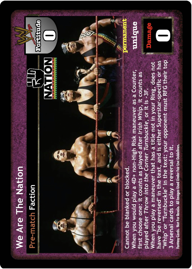 Cannot be blanked and cannot be prevented from being played. When you play a 4D+ non-High Risk maneuver as a Counter, choose one: it is considered to be played after Irish Whip, it is considered to be played after Throw into the Corner Turnbuckle, or it is -3F. When you play a maneuver that has a title not in your Ring, does not have 'be reversed' in the text, and is either Superstar-specific or has 'Whip' or 'Turnbuckle' in the text: your opponent must remove the top 3 cards of his Arsenal from the game to play a reversal to it.