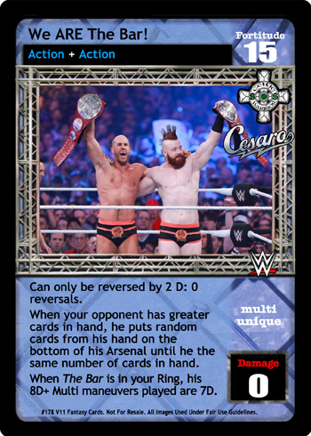 Can only be reversed by 2 D: 0 reversals. When your opponent has greater cards in hand, he puts random cards from his hand on the bottom of his Arsenal until he has the same number of cards in hand. When The Bar is in your Ring, his 8D+ Multi maneuvers played are 7D.