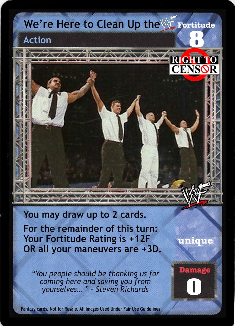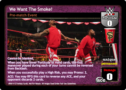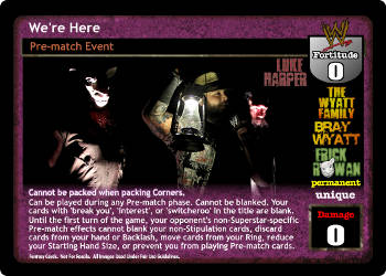 Cannot be packed when packing Corners. Can be played during any Pre-match phase. Cannot be blanked. Your cards with 'break you', 'interest', or 'switcheroo' in the title are blank. Until the first turn of the game, your opponent's non-Superstar-specific Pre-match effects cannot blank your non-Stipulation cards, discard cards from your hand or Backlash, move cards from your Ring, reduce your Starting Hand Size, or prevent you from playing Pre-match cards.