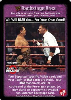 Your Superstar-specific action cards and your Takin' a BASH cards are Multi. Your BASH maneuvers are -4F. At the end of the Pre-match phase, you may blank an opponent's revealed non-Enforcer Backstage card.