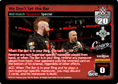 When The Bar is in your Ring, this card is -10F. Reverse any non-Superstar-specific maneuver played from hand, or when The Bar is in your Ring, reverse any maneuver played from hand. Your opponent puts the reversed card on the bottom of his Arsenal, regardless of other effects.ACE: When The Bar is in your Ring and he plays a non-Superstar-specific maneuver, you may discard 2 cards, and his maneuver is Multi.