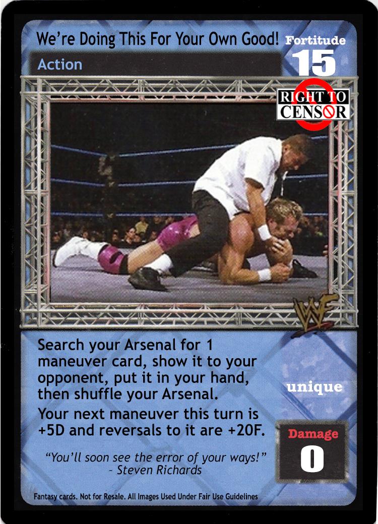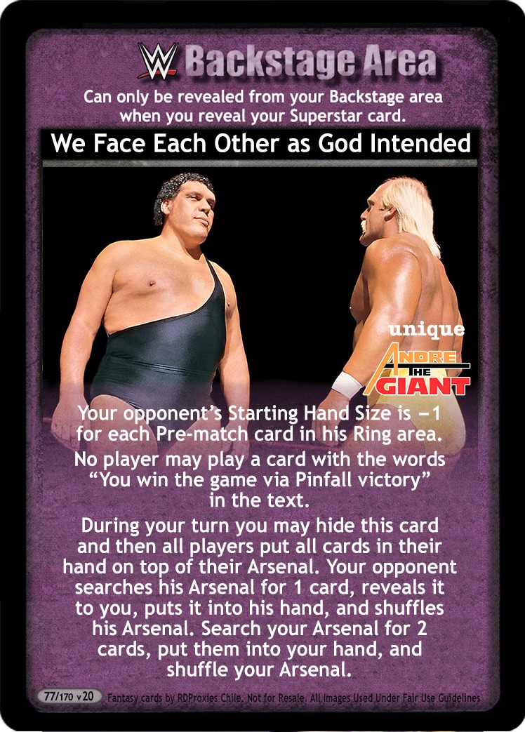 Can only be revealed from your Backstage Area when you reveal your Superstar card. Your opponent's Starting Hand Size is -1 for each Pre-match card in his Ring area. No player may play a card with the words "You win the game via Pinfall victory" in the text. During your turn you may hide this card and then all players put all cards in their hand on top of their Arsenal. Your opponent searches his Arsenal for 1 card, reveals it to you, puts it into his hand, and shuffles his Arsenal. Search your Arsenal for 2 cards, put them into your hand, and shuffle your Arsenal.