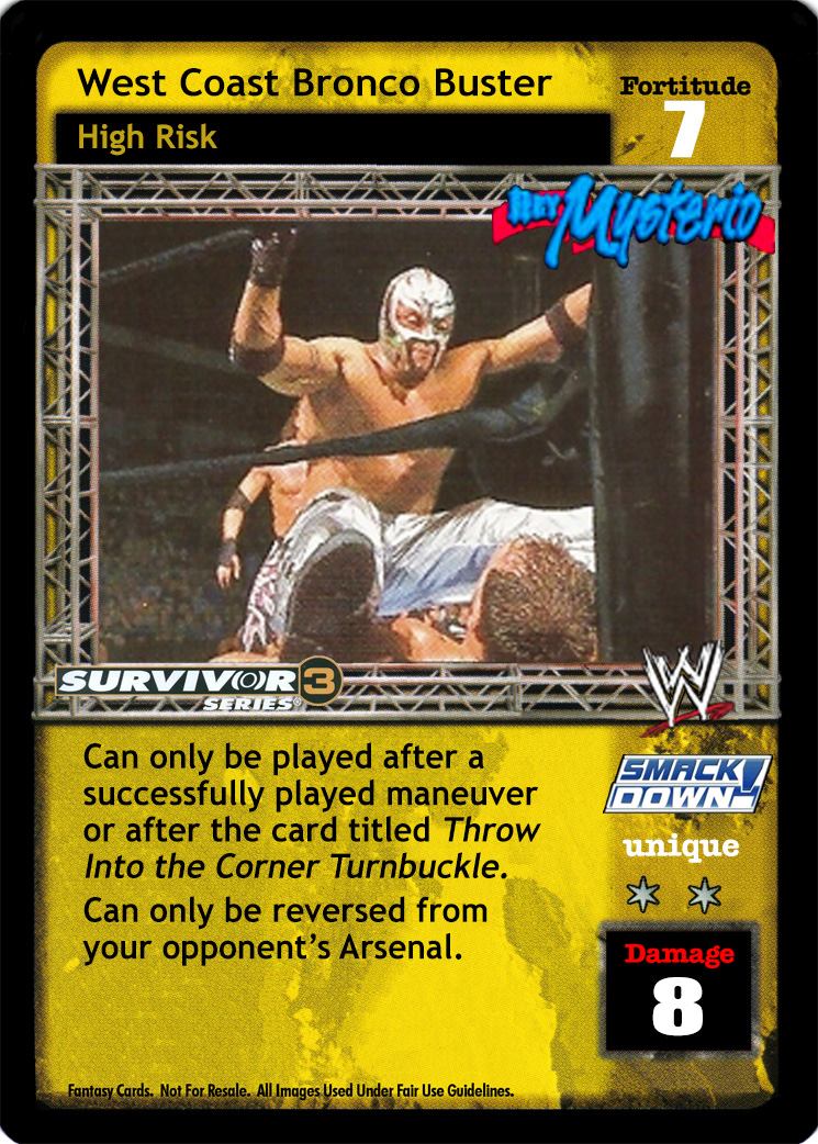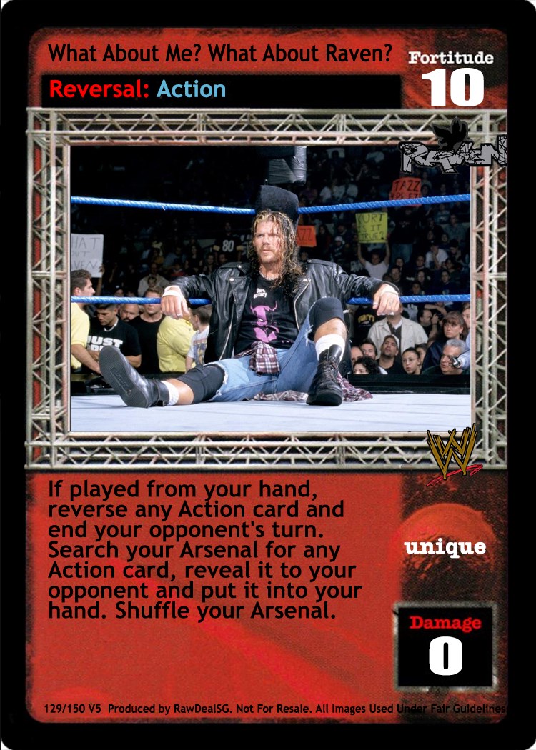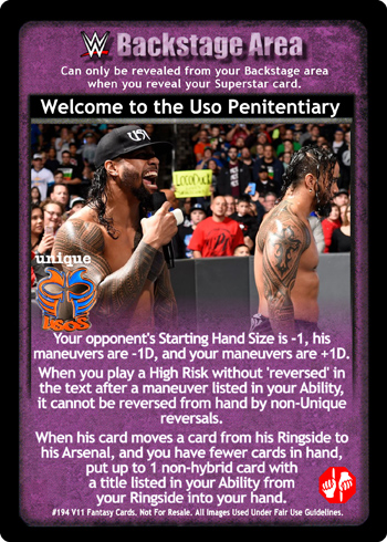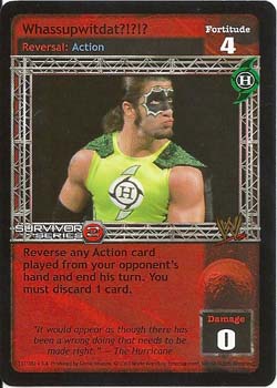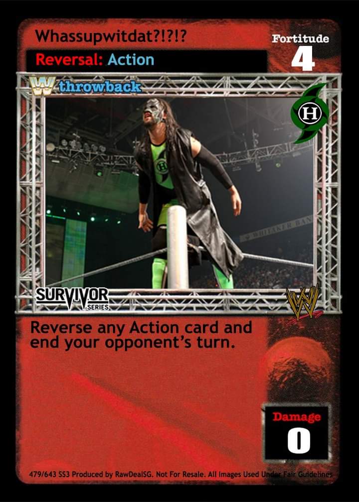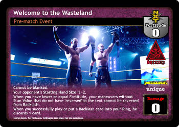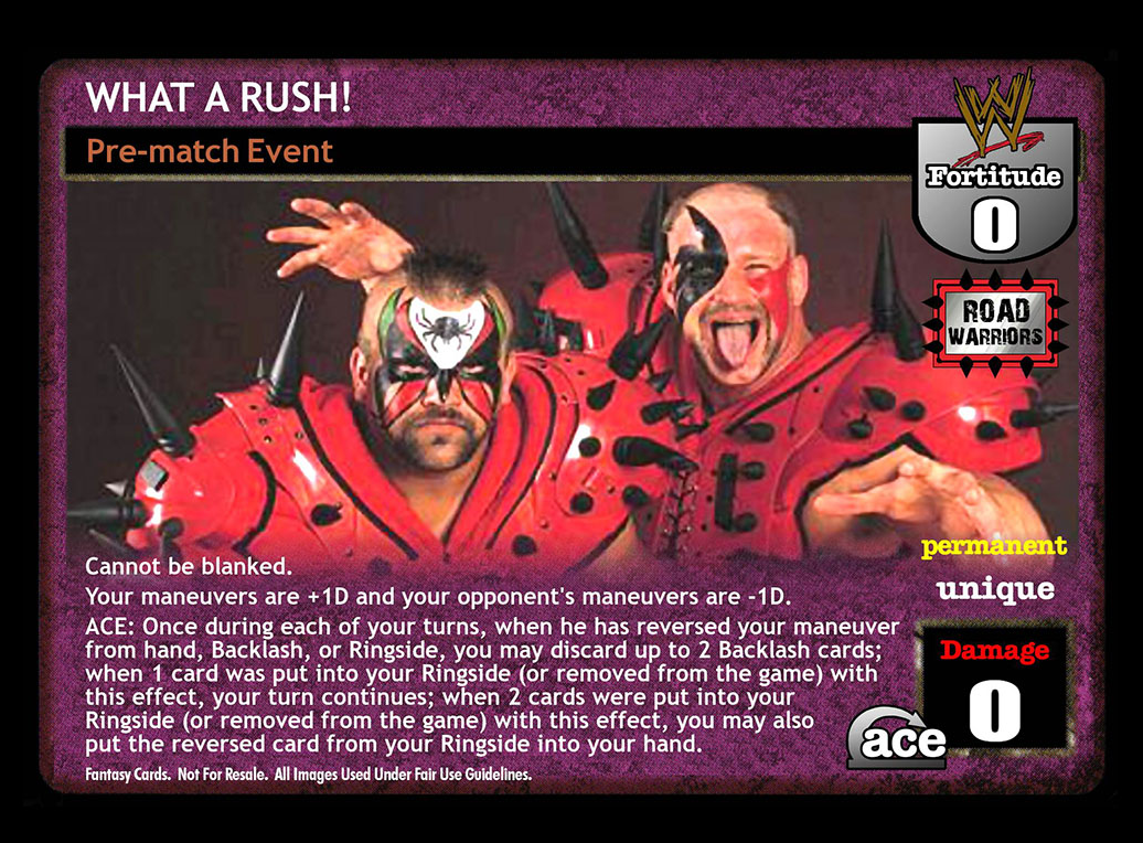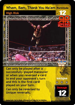 Can only be played after a successfully played maneuver or after the card titled Throw Into the Corner Turnbuckle. Can only be reversed from your opponent's Arsenal.