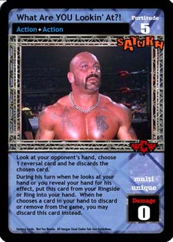 Look at your opponent's hand, choose 1 reversal card and he discards the chosen card. During his turn when he looks at your hand or you reveal your hand for his effect, put this card from your Ringside or Ring into your hand. When he chooses a card in your hand to discard or remove from the game, you may discard this card instead.