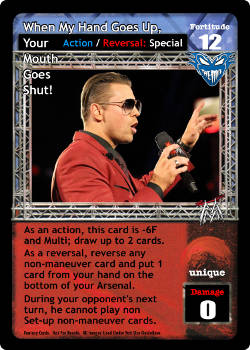 When this card is in your Ring area, during your turn you may put this card into your Ringside pile and if your next two cards played this turn are maneuvers, they can only be reversed from your opponent's Arsenal.