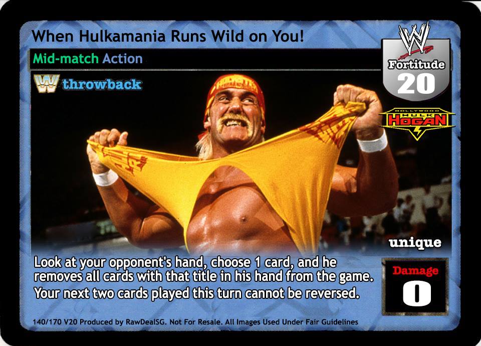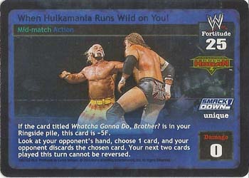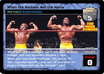 When this card is reversed, put it into your Backlash instead, and your opponent discards 1 card. When you have lower Fortitude, this card is -5F. Your Superstar-specific cards are -5F and when he plays a Unique reversal, he discards 1 card.