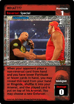 When your opponent plays a non-reversal card from hand and you have lower Fortitude or fewer cards in hand, you may reveal this card from your hand or Ringside, shuffle it into your Arsenal, and the played card is put on top of his Arsenal. You may choose a new Enforcer.