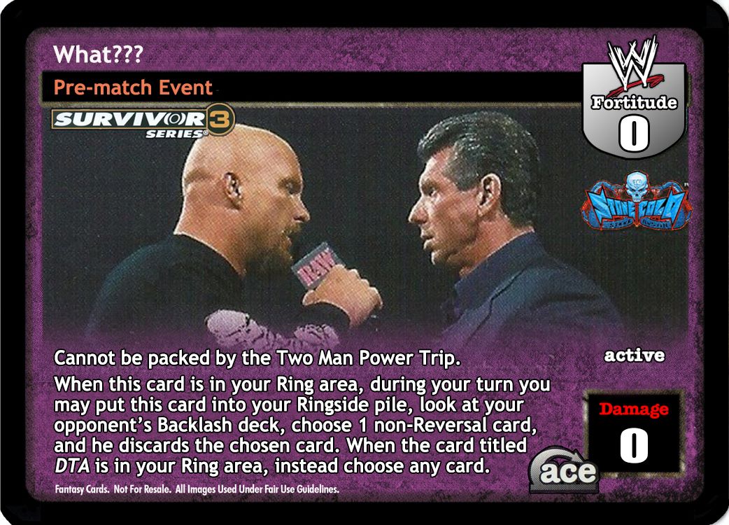 Cannot be packed by the Two Man Power Trip. When this card is in your Ring area, during your turn you may put this card into your Ringside pile, look at your opponent's Backlash deck, choose 1 non-Reversal card, and he discards the chosen card. When the card titled DTA is in your Ring area, instead choose any card.