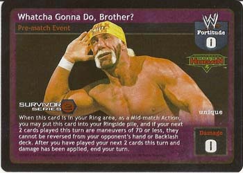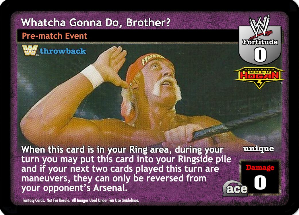 If the card titled Whatcha Gonna Do, Brotha? is in your Ringside pile, this card is -5F. Look at your opponent's hand, choose 1 card, and your opponent discards the chosen card. Your next two cards played this turn cannot be reversed.
