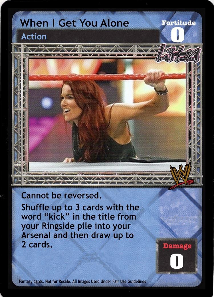 When this card is in your Ring area, as a Mid-match Action, you may put this card into your Ringside pile, and if your next 2 cards played this turn are maneuvers of 7D or less, they cannot be reversed from your opponent's hand or Backlash deck. After you have played your next 2 cards this turn and damage has been applied, end your turn.