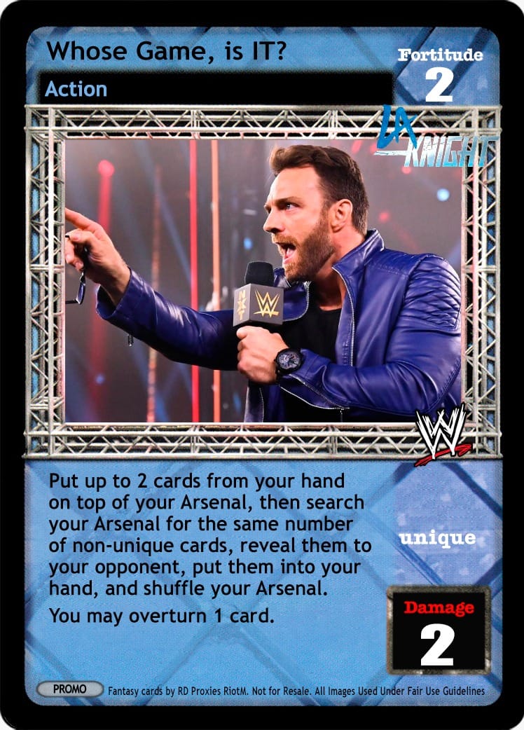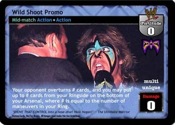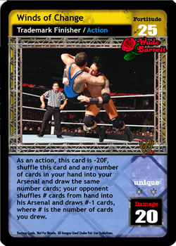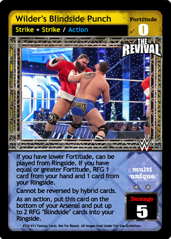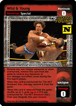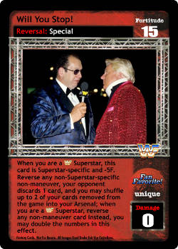When you are a WWF Superstar, this card is Superstar-specific and -5F. Reverse any non-Superstar-specific non-maneuver, your opponent discards 1 card, and you may shuffle up to 2 of your cards removed from the game into your Arsenal; when you are a WWF Superstar, reverse any non-maneuver card instead, you may double the numbers in this effect.