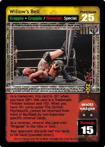 As a maneuver, this card is -5F; when you have 30F+ this card is a Trademark Finisher instead and +5D. When you have 10+ cards under The Sicilian Psychopath, cannot be reversed from hand or Backlash by non Superstar-specific reversal cards. As a reversal, reverse any card with 'Ringside' in the title or text. Your opponent discards half the cards in his hand (rounded down).