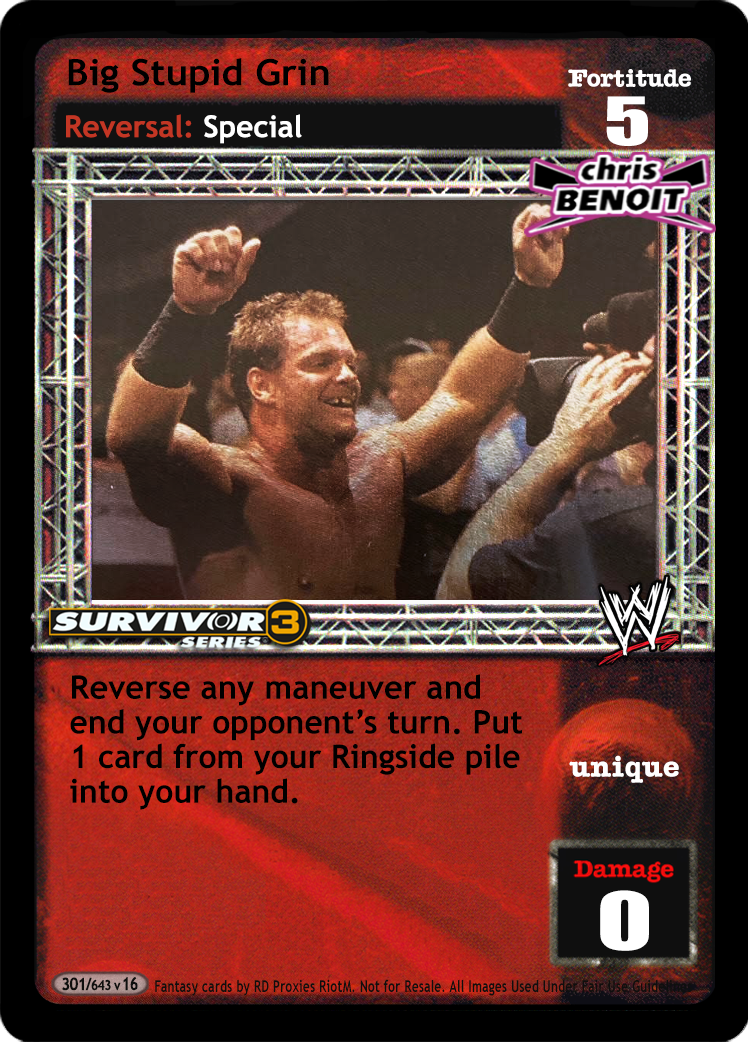 Ignore reversal restrictions from your opponent's cards and completely reverse any 10D+ card; when your opponent is a Tag Team, a Stable, or has As Big And Tough As Any Two Men revealed, flip a Pre-match card in his Ring face-down, and Arsenal / Ringside Search 1 Superstar-specific maneuver. If that is your next card played, you are considered to have +15F and to have successfully played an 8D+ maneuver before it.