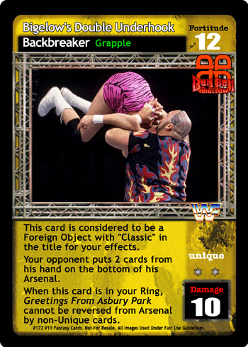This card is considered to be a Foreign Object with 'Classic' in the title for your effects. Your opponent puts 2 cards from his hand on the bottom of his Arsenal. When this card is in your Ring, Greetings From Asbury Park cannot be reversed from Arsenal by non-Unique cards.