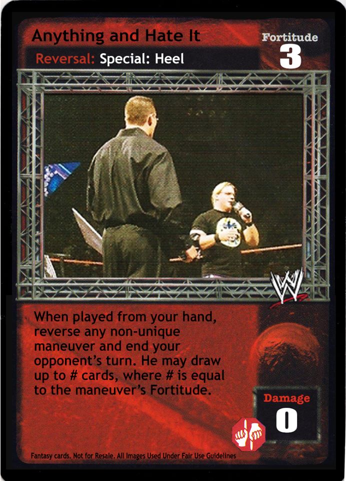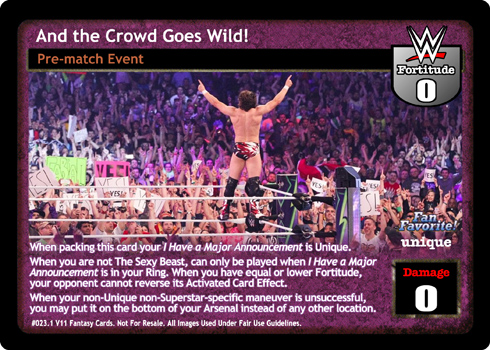 When packing this card your I Have a Major Announcement is Unique. Can only be played when I Have a Major Announcement is in your Ring. When you have equal or lower Fortitude, your opponent cannot reverse its Activated Card Effect. When your non-Unique non-Superstar-specific maneuver is unsuccessful, you may put it on the bottom of your Arsenal instead of any other location.