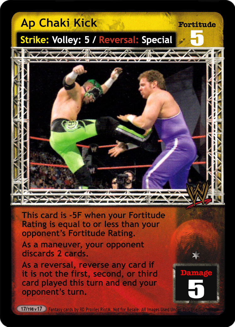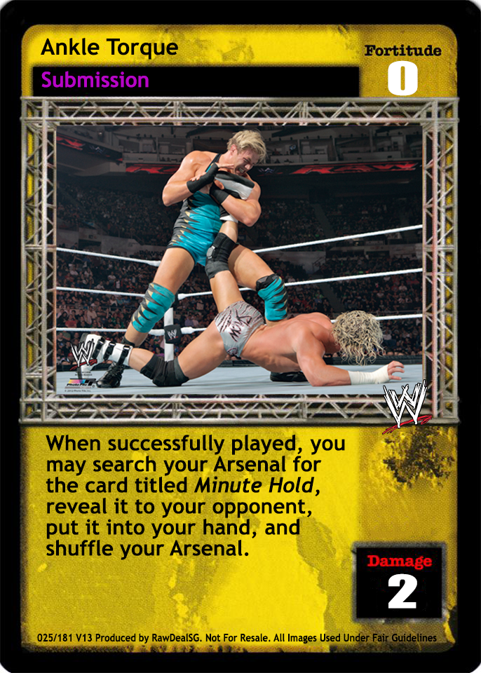 Can only be revealed if your Superstar card says you can reveal an Enforcer card. - Starting Hand Size: +12 Superstar Value: +3 Superstar Ability: + Your maneuvers played from your hand are +1D. You cannot play non-unique Action cards from your hand. - Starting Hand Size: +6 Superstar Value: +1 Superstar Ability: + Once during each of your turns, you may discard 1 card and then search your Arsenal for 1 non-unique card with the word "power," "bomb," or "slam" in the title, reveal it to your opponent, put it in your hand and shuffle your Arsenal. Your cards with the word "power," "bomb" or "slam" in the title are -4F.