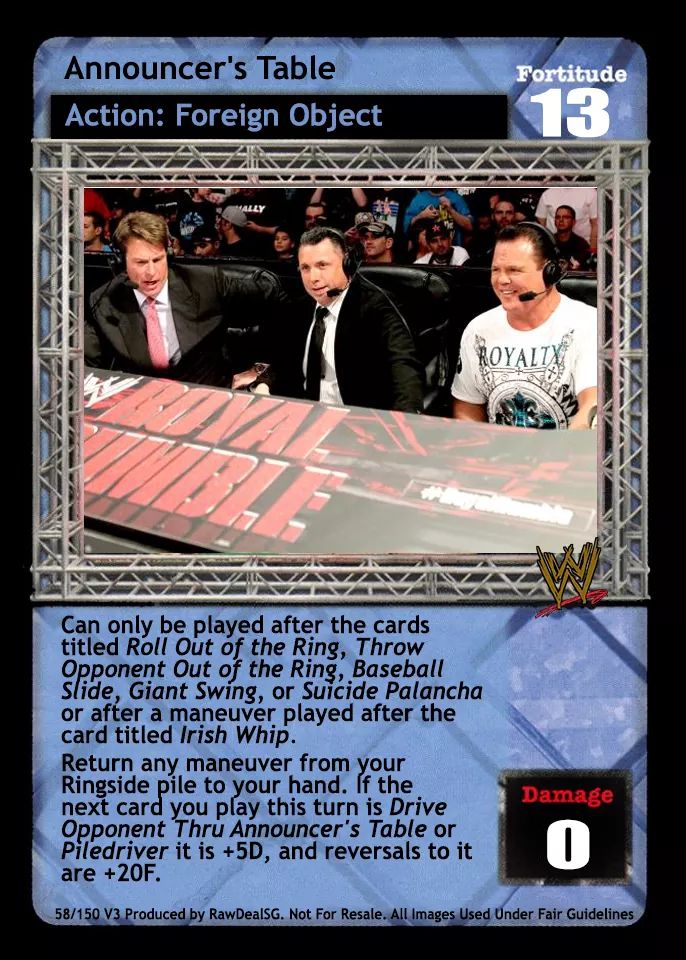 Can only be played after the cards titled Roll Out of the Ring, Throw Opponent Out of the Ring, Baseball Slide, Giant Swing, or Suicide Palancha or after a maneuver played after the card titled Irish Whip. Return any maneuver from your Ringside pile to your hand. If the next card you play this turn is Drive Opponent Thru Announcer's Table or Piledriver it is +5D, and reversals to it are +20F.