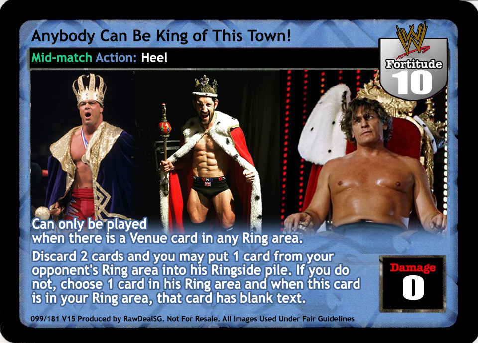 Can only be played when there is a Venue card in any Ring area. Discard 2 cards and you may put 1 card from your opponent's Ring area into his Ringside pile. If you do not, choose 1 card in his Ring area and when this card is in your Ring area, that card has blank text.
