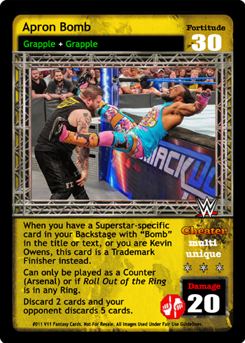When you have a Superstar-specific card in your Backstage with 'Bomb' in the title or text, or you are Kevin Owens, this card is a Trademark Finisher instead. Can only be played as a Counter (Arsenal) or if Roll Out of the Ring is in any Ring. Discard 2 cards and your opponent discards 5 cards.