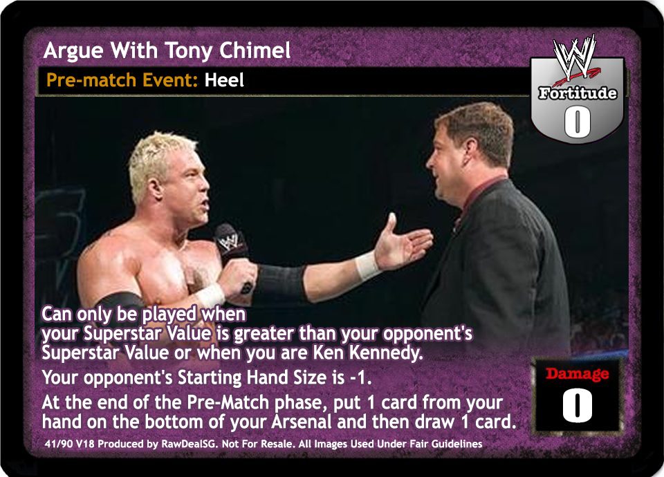 Can only be played when your Superstar Value is greater than your opponent's Superstar Value or when you are Ken Kennedy. Your opponent's Starting Hand Size is -1. At the end of the Pre-Match phase, put 1 card from your hand on the bottom of your Arsenal and then draw 1 card.