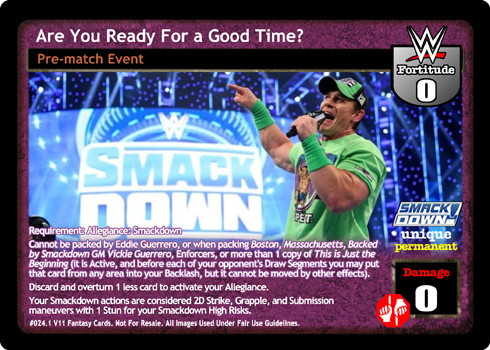 Requirement: Allegiance: Smackdown Cannot be packed by Eddie Guerrero, or when packing Enforcers, Boston, Massachusetts, Backed by Smackdown GM Vickie Guerrero, or more than 1 copy of This is Just the Beginning (it is Active, and before each of your opponent's Draw Segments you may put that card from any area into your Backlash.) Discard and overturn 1 less card to activate your Allegiance. Your Smackdown actions are considered 2D Strike, Grapple, and Submission maneuvers with 1 Stun for your Smackdown High Risks.