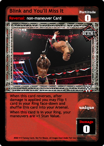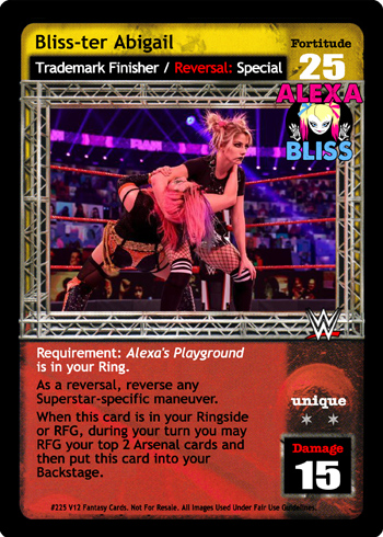 Requirement: Alexa's Playground is in your Ring. As a Reversal, reverse any Superstar-specific maneuver. When this card is in your Ringside or RFG, during your turn you may RFG your top 2 Arsenal cards and then put this card into your Backstage.