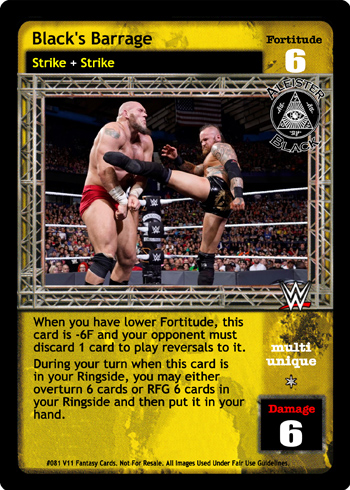 When you have lower Fortitude, this card is -6F and your opponent must discard 1 card to play reversals to it. During your turn when this card is in your Ringside, you may either overturn 6 cards or RFG 6 cards in your Ringside and then put it in your hand.