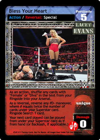 As an action, shuffle any cards with 'Female' or 'Diva' in the text from your Ringside into your Arsenal. As a reversal, reverse any #D- maneuver, where # equals twice the number of cards under your Superstar card. Ringside Search 1 card. Your next card played can be played from under your Superstar card as if from hand (or Backlash, if applicable.)