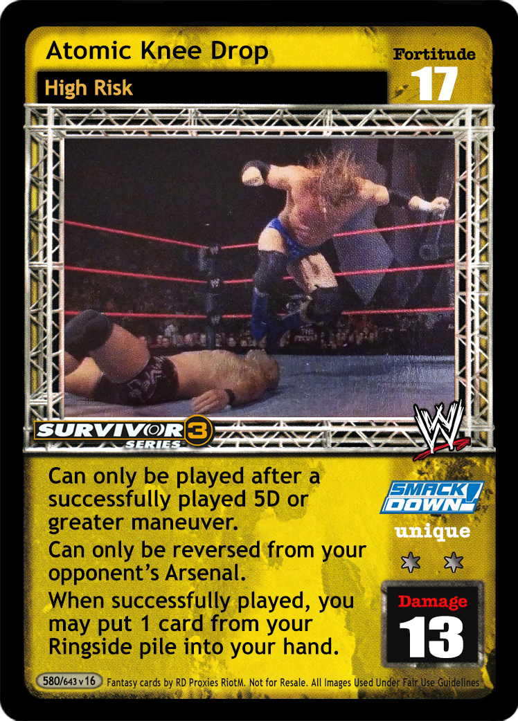 Can only be played after a successfully played 5D or greater maneuver. Can only be reversed from your opponent's Arsenal. When successfully played, you may put 1 card from your Ringside pile into your hand.