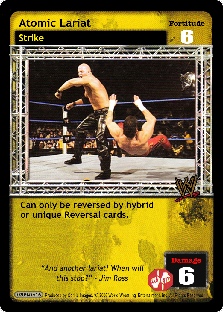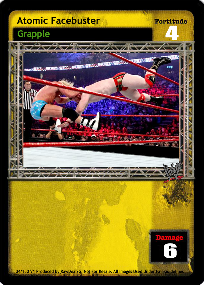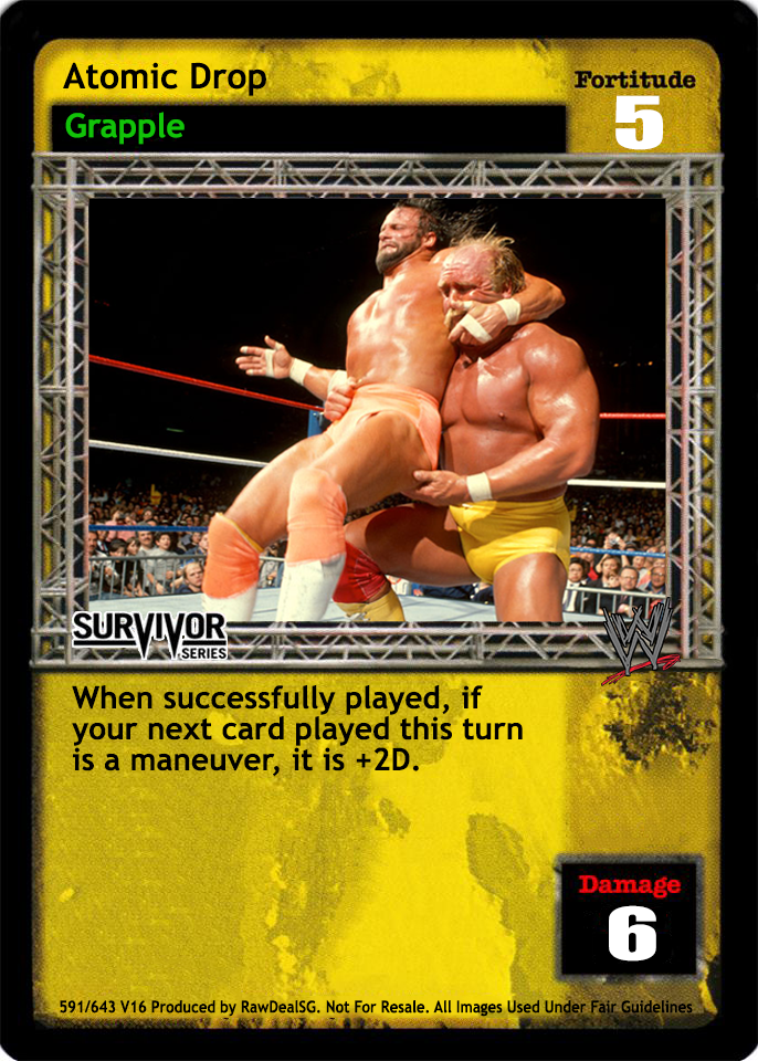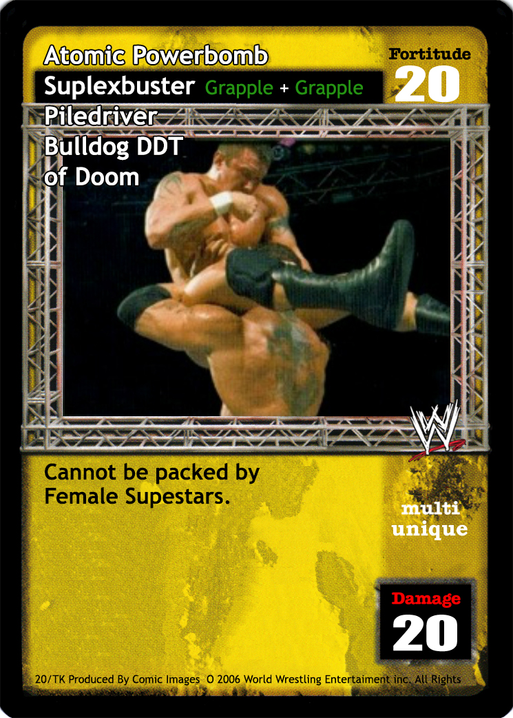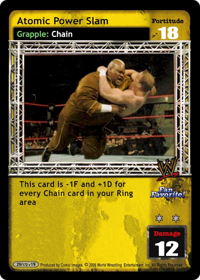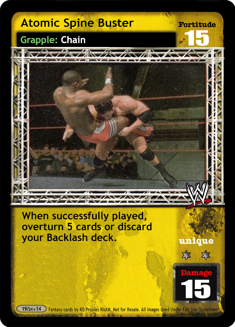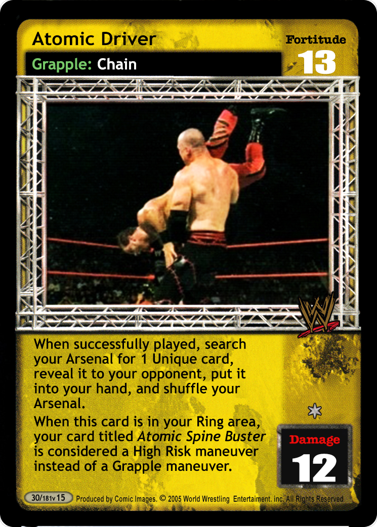 When successfully played, search your Arsenal for 1 Unique card, reveal it to your opponent, put it into your hand, and shuffle your Arsenal. When this card is in your Ring area, your card titled Atomic Spine Buster is considered a High Risk maneuver instead of a Grapple maneuver.