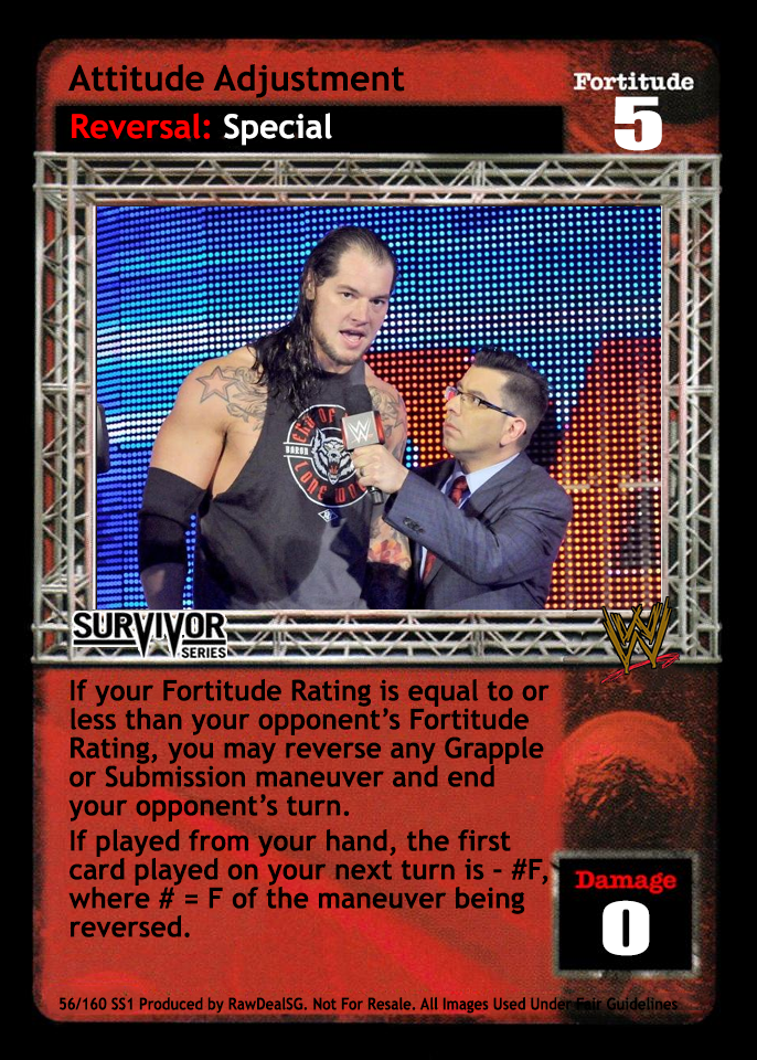 If your Fortitude Rating is equal to or less than your opponent's Fortitude Rating you may reverse any Grapple or Submission maneuver and end your opponent's turn. If played from your hand, the first card played on your next turn is - #F, where # = F of the maneuver being reversed.