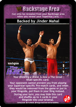 Your Drawing a Blank is now a The Great Khali-specific card. Your opponent cannot prevent you from playing your Superstar-specific Pre-match cards, and when they would be removed from the game or put in your Ringside, put them in your Ring instead. During your turn, you may hide this card and shuffle up to 3 cards in your Ringside into your Arsenal.