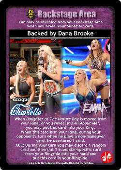 When Daughter of The Nature Boy is moved from your Ring, or you reveal It's All About Me!, you may put this card into your Ring. When this card is in your Ring, during your opponent's turn when plays a non-maneuver card, he overturns 1 card. ACE: During your turn you may discard 1 random card and then put 1 Superstar-specific card from your Ringside into your hand and put this card in your Ringside.