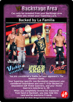 You are considered a Stable for your opponent's The Numbers Game. Your Superstar-specific non-Revolution maneuvers are considered Smackdown and non-F: 0 for Backed by Smackdown GM Vickie Guerrero, and your Vickie Guerrero Interferes is -5F. When you completely reverse his maneuver from hand or Backlash, you may hide this card and he overturns 5 cards.