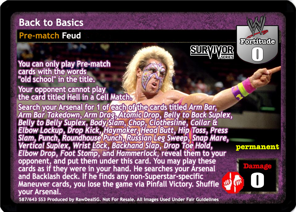 You can only play Pre-match cards with the words "old school" in the title. Your opponent cannot play the card titled Hell in a Cell Match. Search your Arsenal for 1 of each of the cards titled Arm Bar, Arm Bar Takedown, Arm Drag, Atomic Drop, Belly to Back Suplex, Belly to Belly Suplex, Body Slam, Chop, Clothesline, Collar & Elbow Lockup, Drop Kick, Haymaker, Head Butt, Hip Toss, Press Slam, Punch, Roundhouse Punch, Russian Leg Sweep, Snap Mare, Vertical Suplex, Wrist Lock, Backhand Slap, Drop Toe Hold, Elbow Drop, Foot Stomp, and Hammerlock, reveal them to your opponent, and put them under this card. You may play these cards as if they were in your hand. Your opponent searches your Arsenal and Backlash deck. If he finds any non-Superstar-specific Maneuver cards, you lose the game via Pinfall Victory. Shuffle your Arsenal.